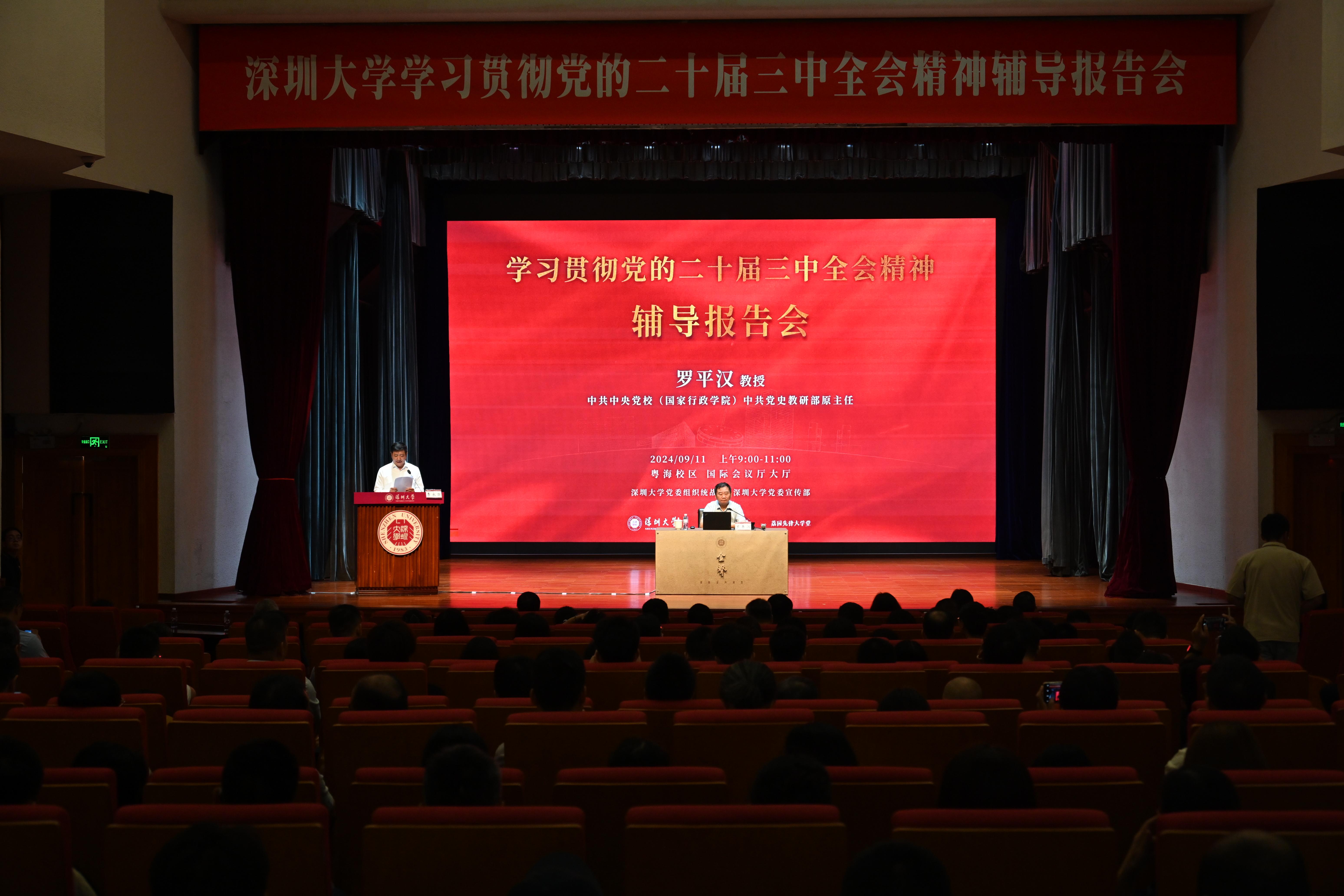 為深入學習宣傳貫徹黨的二十屆三中全會精神,9月11日上午,深圳大學在粵海校區國際會議廳舉辦“荔園金聲講堂”暨“荔園先鋒大學堂”第五期講座——學習貫徹黨的二十屆三中全會精神輔導報告會。中共中央黨校(國家行政學院)中共黨史教研部原主任、教授、博士生導師羅平漢應邀作專題報告。深圳大學黨委副書記、紀委書記王月興,副校長李永華、汪永成、張曉紅出席報告會,學校中層干部、教職工黨支部書記、師生黨支部書記、學生黨支部書記代表、黨建組織員、黨務秘書、統戰人士代表等400余人現場聆聽。李永華主持報告會。