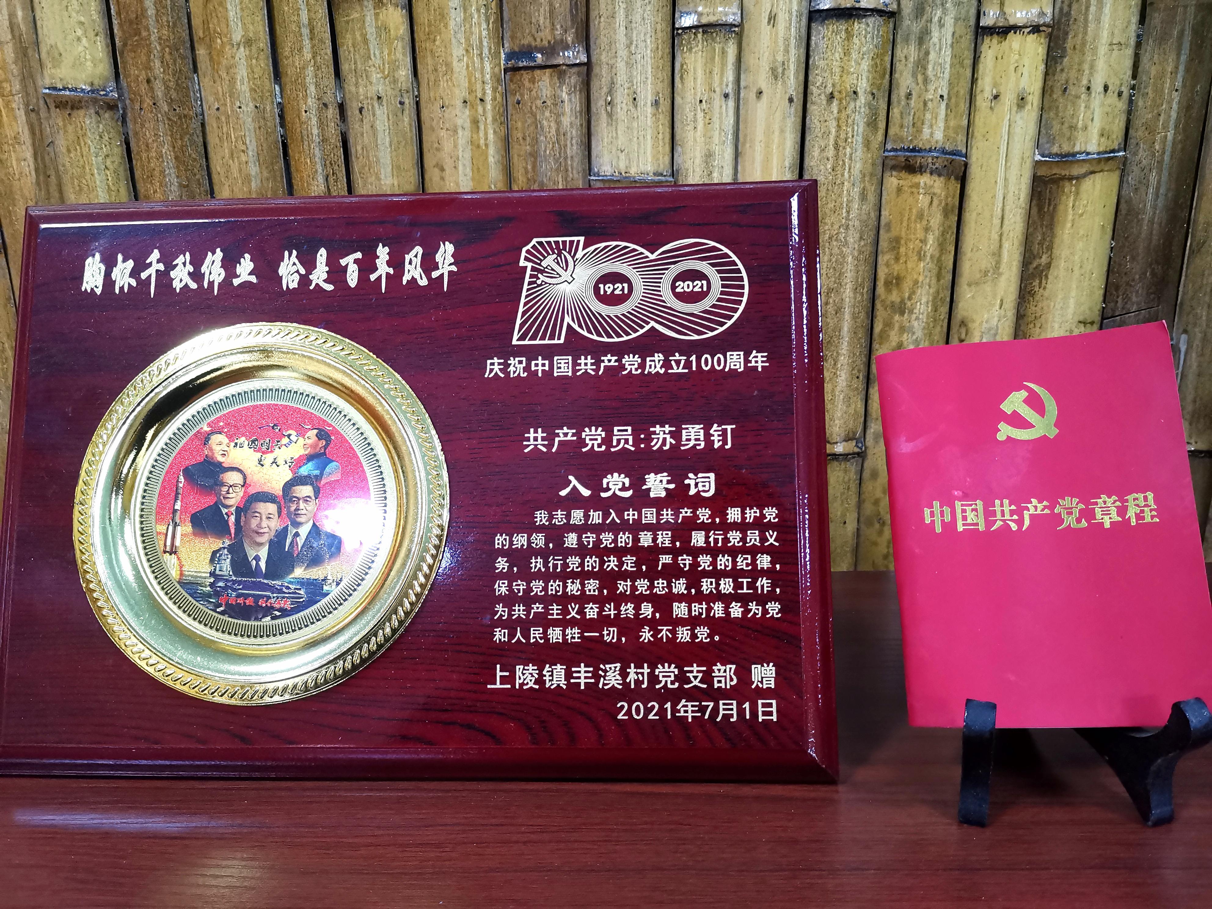 踏入瑞豐生態(tài)農(nóng)莊的大門,映入眼簾的便是豐溪村黨支部贈送給蘇勇釘?shù)囊粔K入黨誓詞木牌,旁邊還擺放著一本中國共產(chǎn)黨章程。這樣一塊小小的誓詞牌、一本薄薄的章程冊子,蘇勇釘卻對此珍愛有加;而提及他的黨員身份,蘇勇釘?shù)恼Z氣中也滿是驕傲。胸懷千秋偉業(yè),恰是百年風華,他提到,正值中國共產(chǎn)黨成立100周年的重要節(jié)點,這兩樣紀念物不僅讓他時刻謹記自己共產(chǎn)黨員的身份,也是對自身行為的一種約束和規(guī)范,鞭策著他不斷前行。