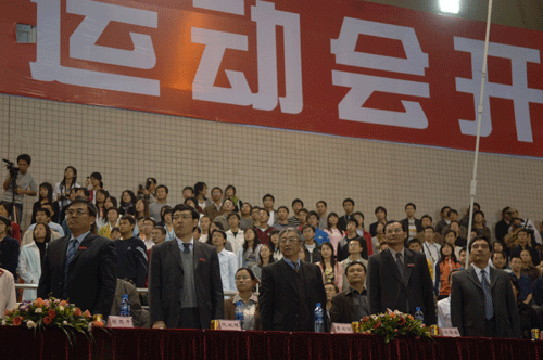 傍晚18:30,入場儀式正式開始。國旗隊、校旗隊、紅旗隊、鮮花隊,依次走來,引領各支方隊步入運動場。“奧運中華,熊熊圣火,招集群雄任叱咤;和諧深大,青青校園,積聚英才比高下!”研究生方隊揮舞著青春的旗幟,首先向主席臺走來。各學院、教輔單位、直屬機關等共34支代表隊,依次通過主席臺,接受檢閱。“精致管理,精致服務,高校之林,后來居上!”直屬機關代表隊邁著堅定步伐,喊著嘹亮口號壓軸進場。在主席臺前,各方隊各顯神通,大展才華,炫麗花車、奧運福娃,紛紛前來助陣;方隊陣式、武術舞蹈,亮出各自特色。配以廣播員精彩紛呈的解說,在場觀眾在短時間對各代表隊有了充分的了解,全場不時爆發出陣陣熱烈掌聲。