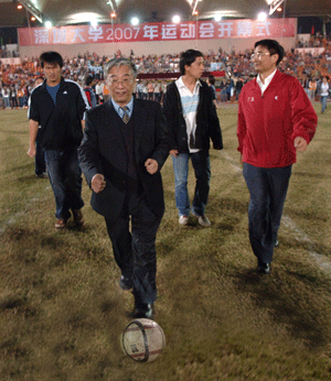 校黨委書記江潭瑜宣布“深圳大學2007年運動會開幕”;校長章必功為開幕式后舉行的“校長杯”足球賽開球。運動會開幕式由副校長邢鋒主持。