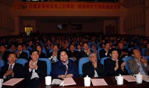 12月22日晚,國際會議廳燈火輝煌,我校校友和留學生迎新年聯歡晚會在這里精彩上演。校領導章必功、陶一桃、阮雙琛、李永華、李鳳亮,各學院校友代表,留學生部師生共四百多人出席晚會。晚會的主題是:一米陽光,百年風光。為的是凸顯全體校友無上的聚能,締造特區大學永恒的光榮。本場晚會,收到21個學院的54個班級為校友大廈捐款,共計132.6522萬元。至此,深大25周年校慶期間,共有12000多名校友返校參加校慶活動,捐款近3000萬元。
