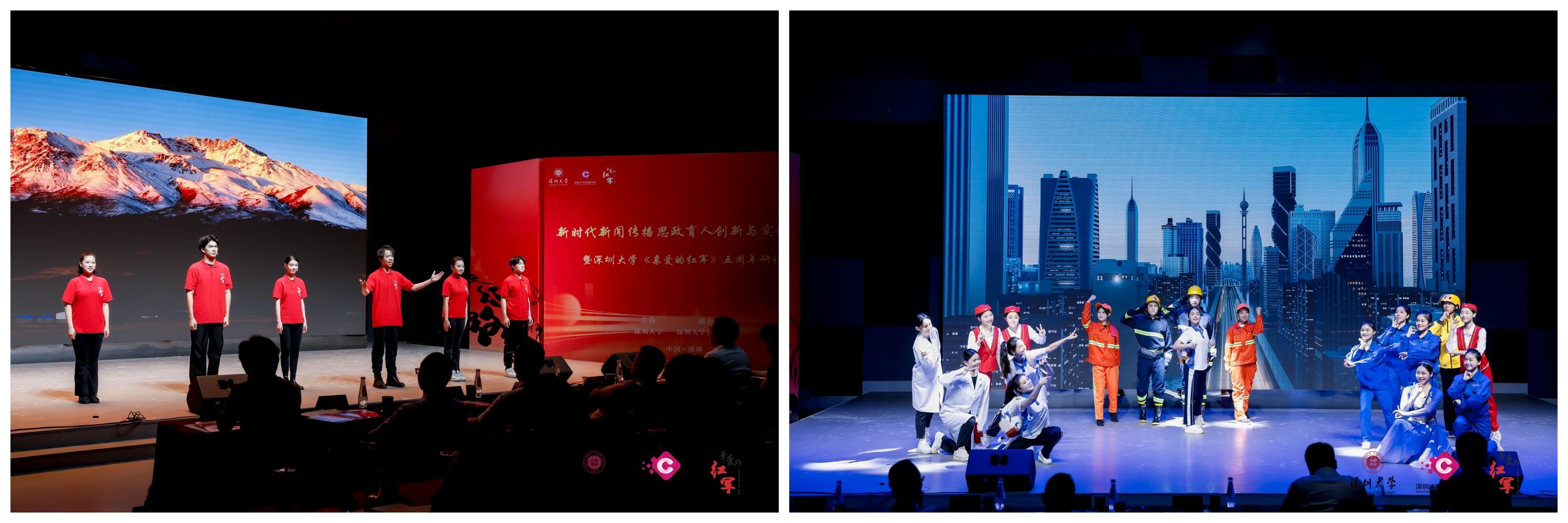 深圳大學(xué)傳播學(xué)院依托深圳市委宣傳部、深圳大學(xué)黨委聯(lián)合組建的“部校共建”機(jī)制,結(jié)合專業(yè)特色,自2019年起著力打造國(guó)內(nèi)首個(gè)以學(xué)生為主體、自編自導(dǎo)自演的長(zhǎng)征題材公益舞臺(tái)講演劇《親愛(ài)的紅軍》。該劇通過(guò)多媒體技術(shù)與傳統(tǒng)舞臺(tái)表演藝術(shù)相結(jié)合、歷史與現(xiàn)代相穿插的演繹手法傳播紅色文化和革命精神,目前已在國(guó)內(nèi)公益巡演38場(chǎng),觀眾達(dá)6萬(wàn)余人,獲得光明日?qǐng)?bào)、人民網(wǎng)等主流媒體120余次報(bào)道,7次榮登學(xué)習(xí)強(qiáng)國(guó),獲得中組部、中宣部、教育部等領(lǐng)導(dǎo)的高度贊揚(yáng)。