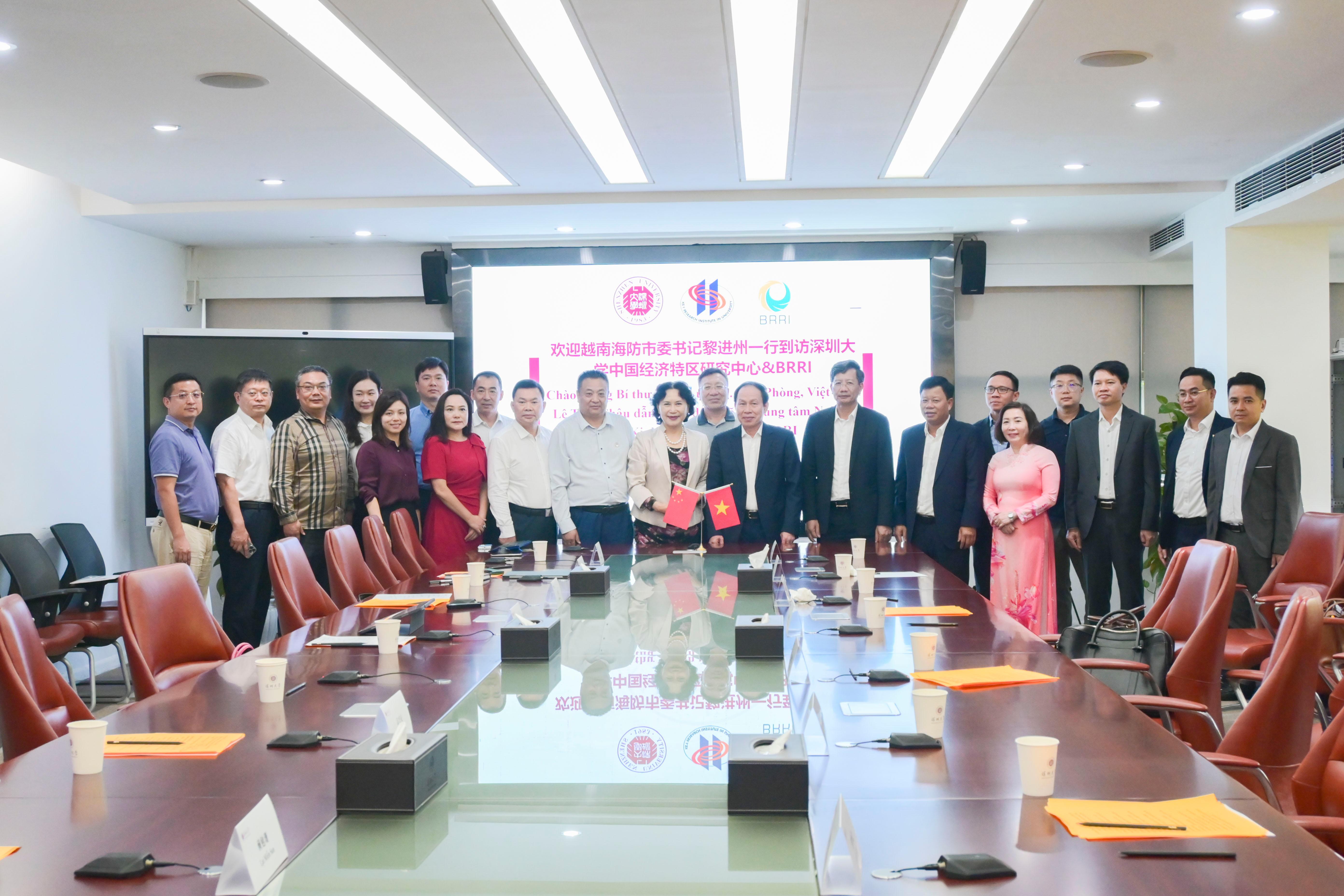 8月5日下午,越南海防市代表團一行到訪深圳大學中國經濟特區研究中心,雙方在匯元樓201會議室舉行座談。越共中央委員、海防市委書記、市國會代表團團長黎進州,海防市委常委、越南海防市祖國陣線主席陶重德一行30余人,深圳大學校長、中國科學院院士毛軍發,副校長汪永成,一帶一路國際合作發展(深圳)研究院、中國經濟特區研究中心相關負責人和相關領域專家學者、企業家參加座談。