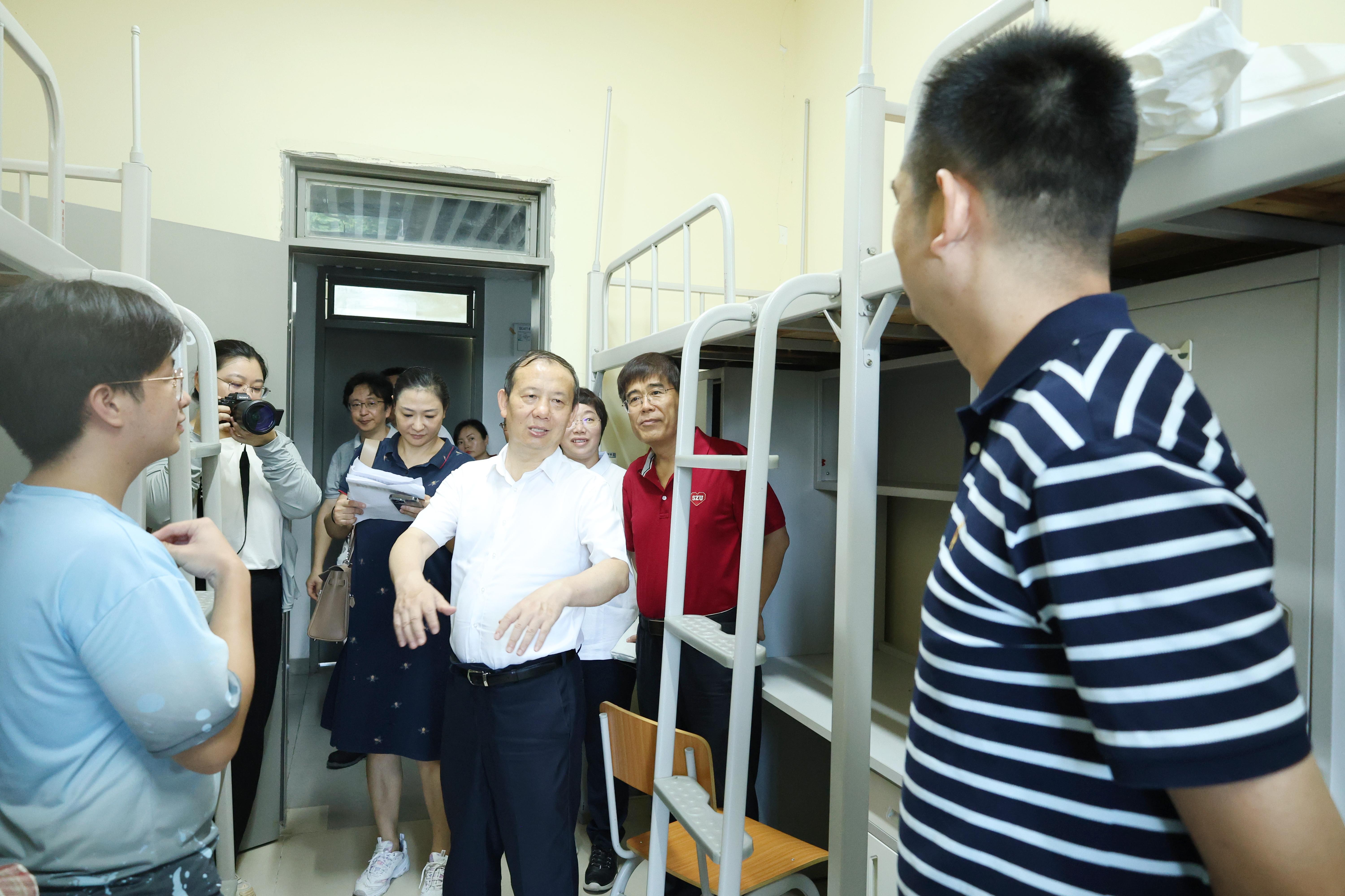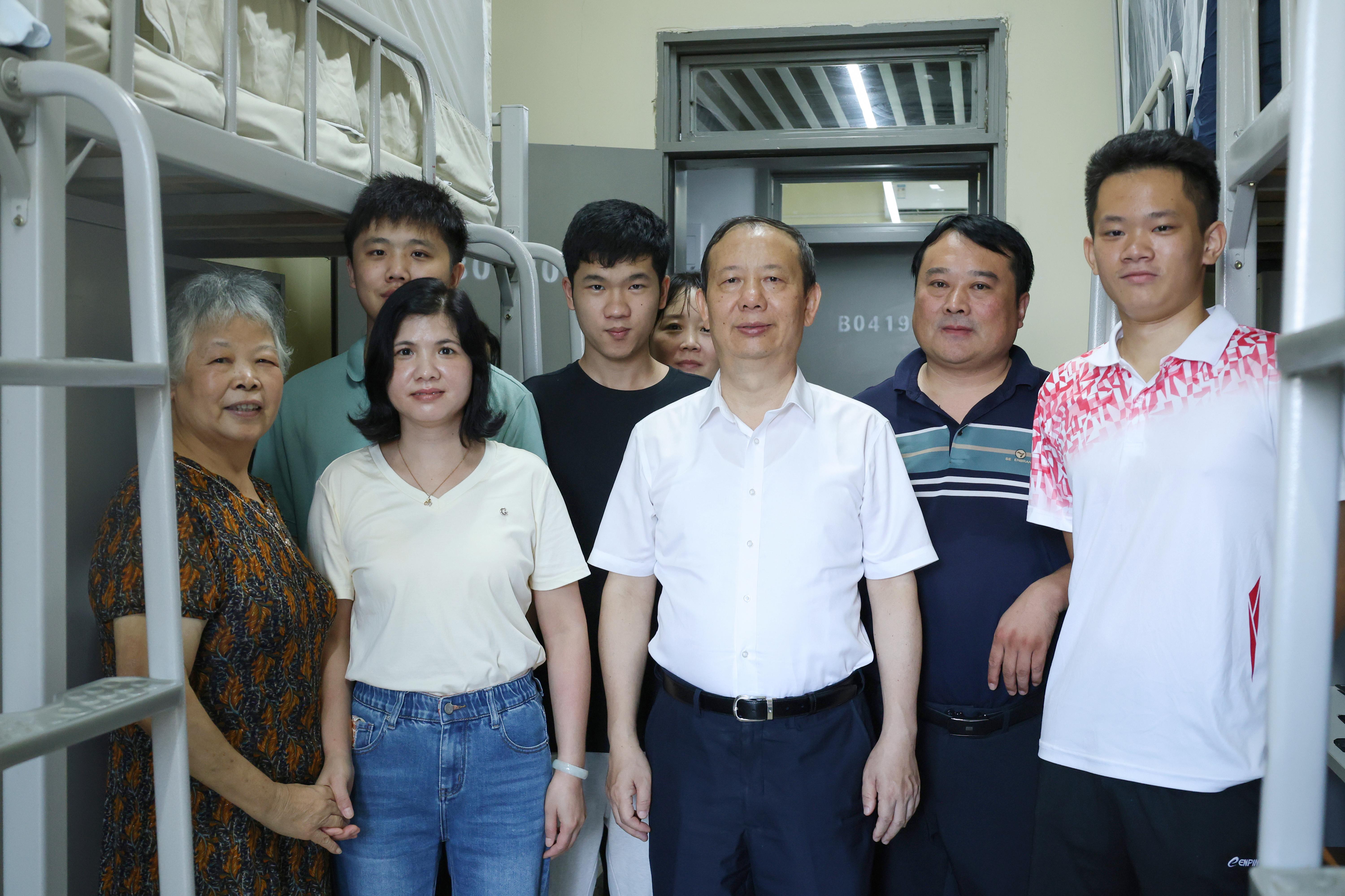 開學首日,深圳大學校長毛軍發、副校長汪永成及相關部門負責人走訪迎新現場,歡迎來自五湖四海的2024級新同學。毛軍發仔細詢問新生入學工作進展,要求各部門做好各項服務保障工作;在聚翰齋宿舍區,毛軍發與新生及家長親切交談并勉勵新生們好好學習。