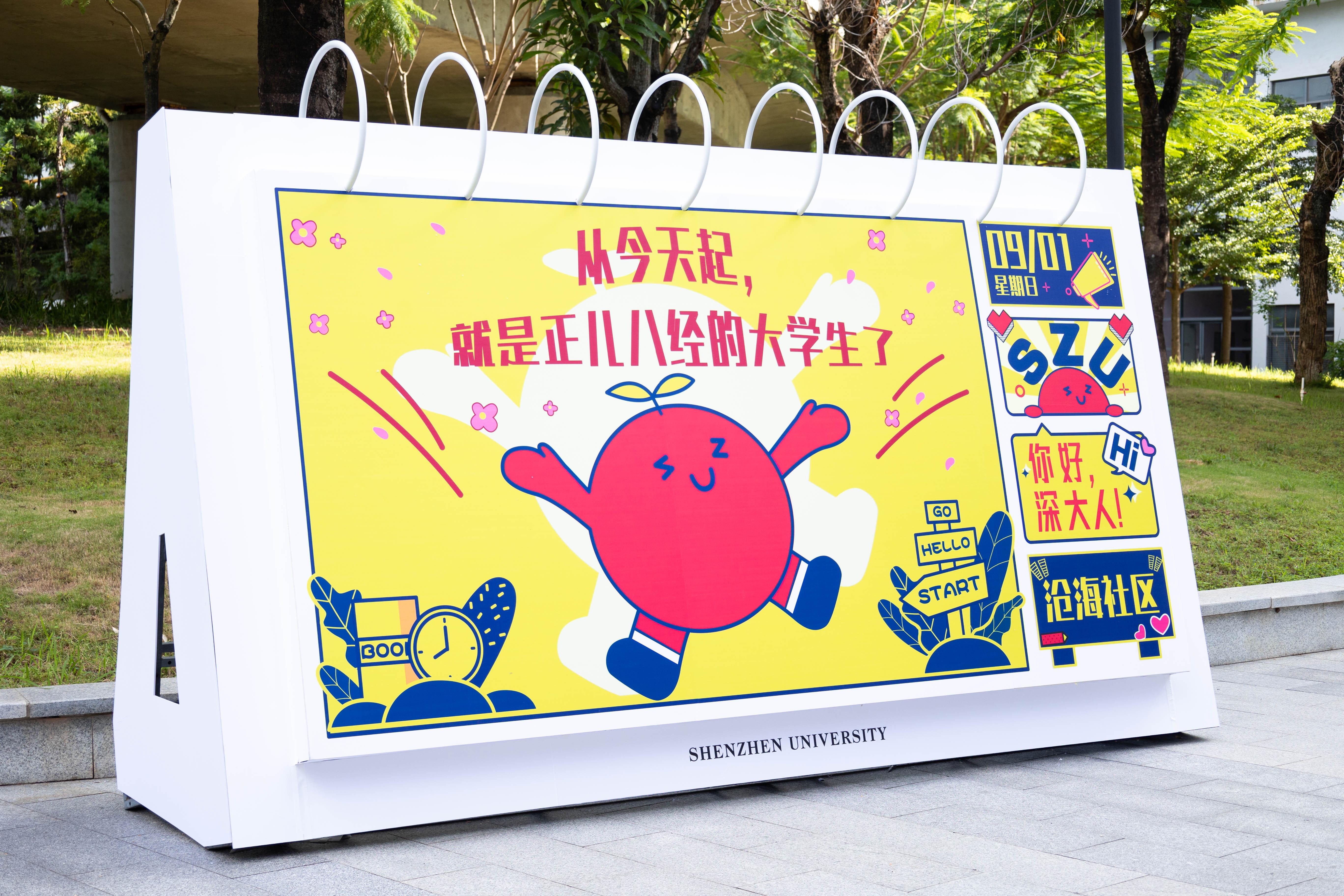 今天,不少新生背著“深大盒子”、穿著新生T恤衫來報到,白色的盒型小背包里裝著錄取通知書、校園卡、學校地圖等。來到校園里,深大“萌新”們再次感受到了學校的心意。學校結合今年錄取通知書的風格設置了許多標語和歡迎圖,五大學生社區分別設置了超大的“入學臺歷”,每天會“翻頁”更換內容,幫助新生更快熟悉校園。