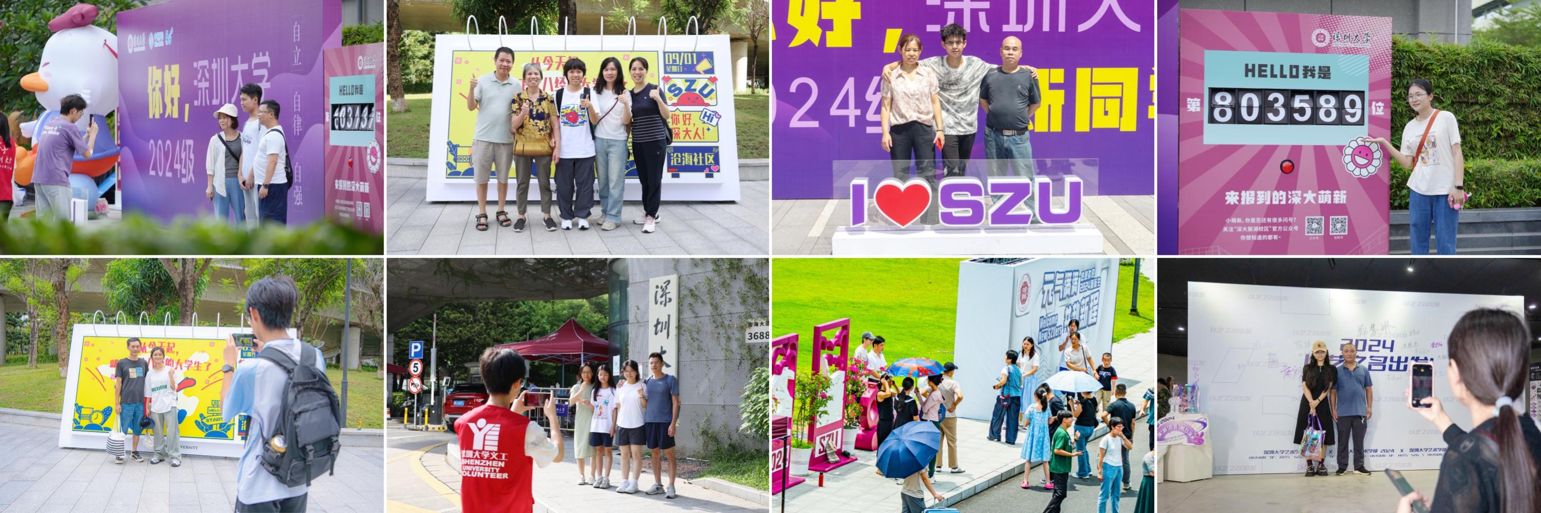 I?SZU的巨大展臺在陽光下熠熠生輝,聽山餐廳、南區飯堂、凱風餐廳、運動廣場還準備了特色拍照框。“好好吃飯,元氣滿滿”“好好運動,無悔青春”,“咔嚓”一聲,留下我們在深大的第一張照片。“爸爸媽媽,你們放心,我已經長大了。在深大,我會照顧好自己,你們也要注意身體。”