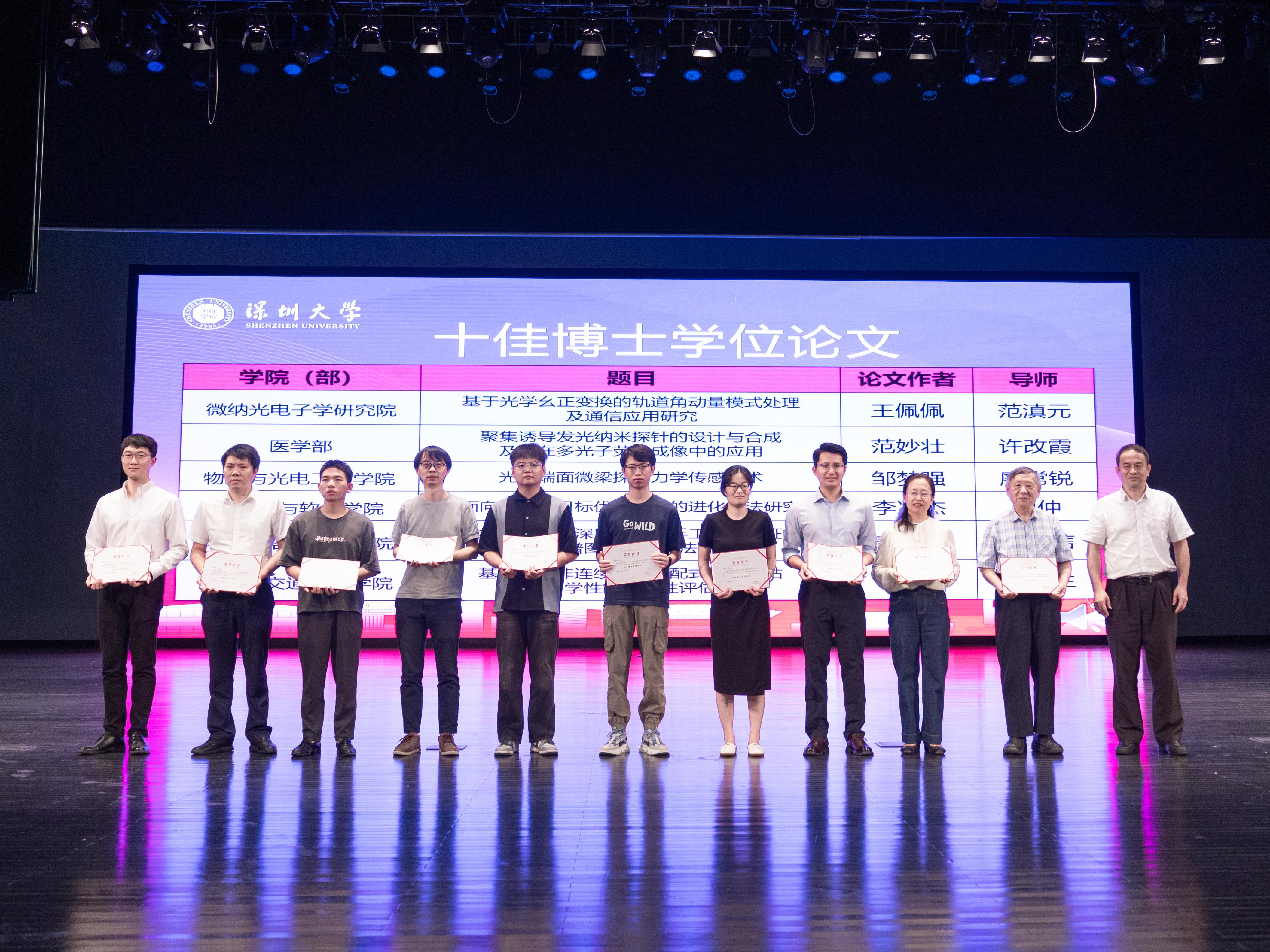 培訓會還現場舉辦深圳大學優秀研究生學位論文頒獎儀式。據悉,自2023年以來,深圳大學每年都會開展一次優秀碩博畢業論文評選工作,以期提高研究生論文質量,樹立研究生追求卓越典型。今年,深圳大學共評選出6篇“十佳博士論文”、6篇“十佳提名論文”及93篇“百優碩士論文”。頒獎儀式上,周輝等為獲得“十佳博士論文”“十佳提名論文”獎的導師及學生和“百優碩士論文”的獲獎代表頒獎。