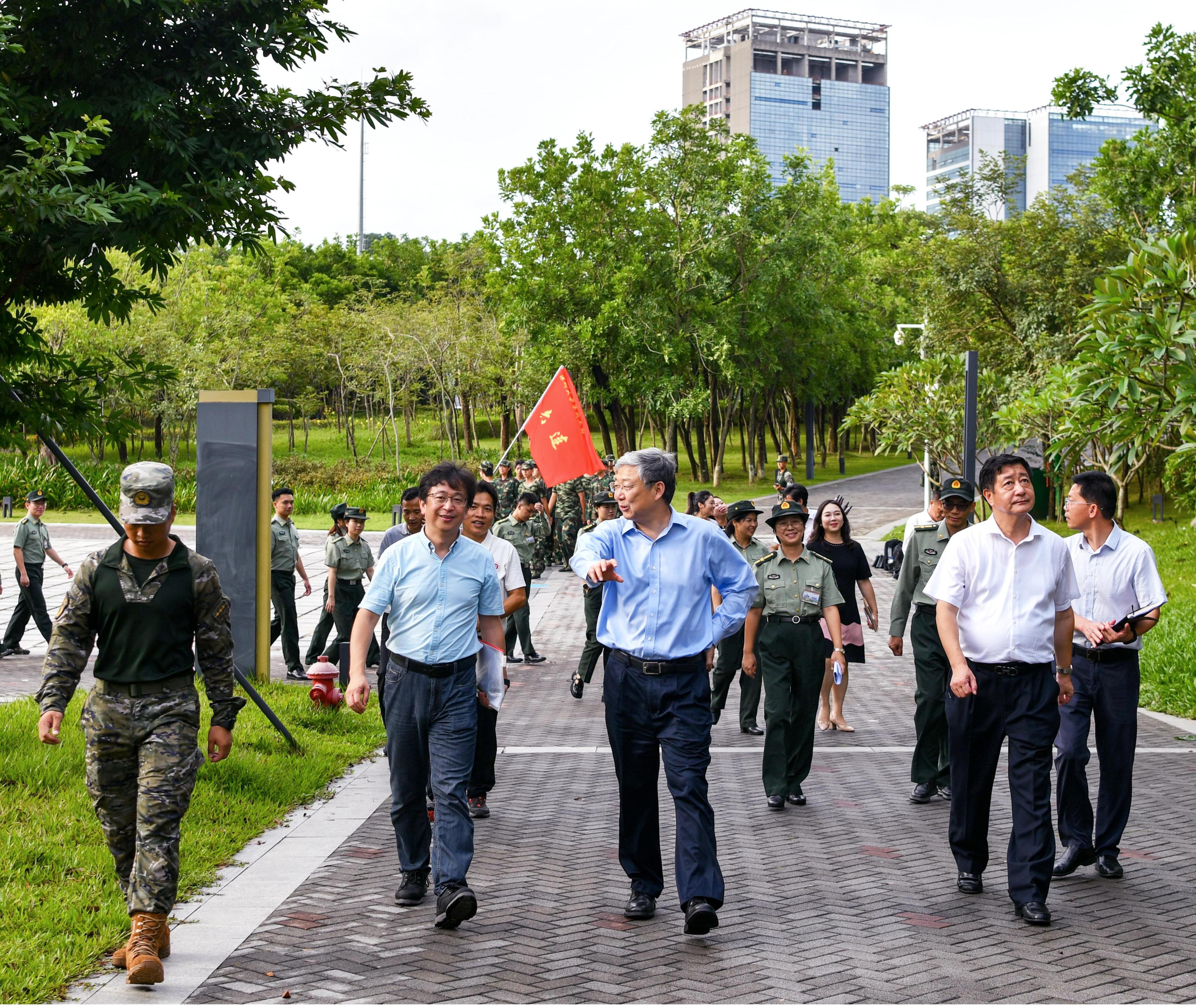 26日,毛軍發、汪永成一行到粵海校區田徑場、南區體育館,了解軍訓一團、二團訓練進展,為新生、承訓教官等送上親切的問候。新生們規范的軍姿、整齊劃一的步伐展現了團結一致、積極向上的精神面貌,毛軍發、汪永成不禁豎起大拇指表示贊賞。“看到你們這樣訓練有素的隊伍,我感到非常欣慰,非常高興。”毛軍發與新生們分享自己在中國人民解放軍國防科技大學讀書時的經歷,“我的終身遺憾之一就是沒有參加軍訓,因為當時軍校是不用軍訓的。我很羨慕你們能有這樣的經歷。”毛軍發希望新生們珍惜軍訓時光,淬煉自我,既要保持體格硬朗,又要堅持學習知識,做到“文武雙全”。“大家在一起就都是‘戰士’,我們的隊伍就是一個溫暖的大家庭!”毛軍發鼓勵新生們團結協作、相互支持鼓勵,通過軍訓收獲精神和體魄的雙重提升,培養使自己終身受益的優良品格,用嶄新的精神面貌和堅定的信念迎接大學生活。“我相信,將來你們一定會時常回憶起這段美好的經歷!”毛軍發還鼓勵新生們積極參軍報國,發揮深大學子應有的作用,為我國強軍事業作出貢獻。