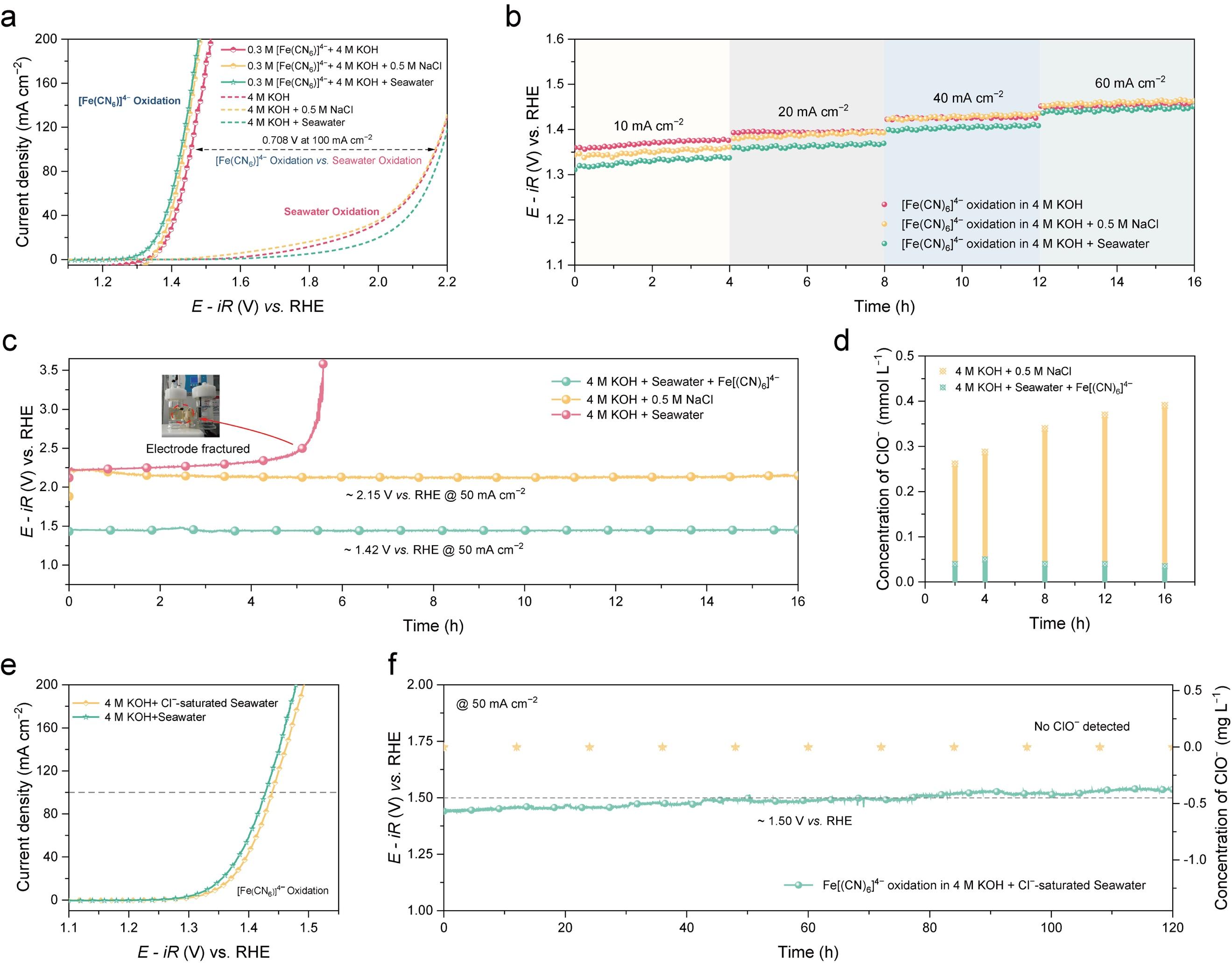 不同于2022年11月謝和平院士團隊Nature正刊上提出的相變遷移海水直接電解制氫顛覆性原理技術,該研究是謝和平院士團隊圍繞海水中的氯離子引發(fā)副反應和電極腐蝕現(xiàn)象,提出的另一種新的解耦式海水直接電解制氫策略。論文系統(tǒng)研究了鐵氰酸根/亞鐵氰酸根電對([Fe(CN)6]3?/4?)在真實海水體系下可逆氧化還原特性,探明了電解系統(tǒng)陰極析氫反應與陽極亞鐵氰酸根氧化反應的高效性,厘清了解耦體系下氧氣自發(fā)穩(wěn)定產出的反應機理,實現(xiàn)了全新系統(tǒng)在真實海水環(huán)境下250小時的長時間穩(wěn)定。該項原理技術巧妙規(guī)避了海水中氯離子對電解制氫反應的干擾,充分驗證了解耦式海水直接電解制氫系統(tǒng)在復雜海水環(huán)境下的抗腐蝕性與對氯離子副反應的應用潛力,將有助于豐富和進一步構建破解海水復雜成分影響的海水電解制氫理論體系和技術框架。