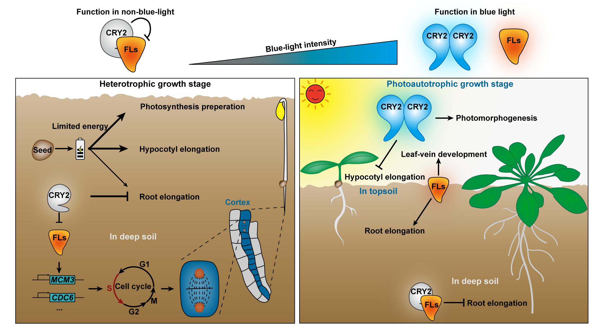 該研究發現擬南芥藍光受體CRY2在黑暗中居然調控細胞分裂、光合作用等多個重要生命過程相關基因表達。進一步表型觀察發現,黑暗條件下,在通常會被忽視的黃化苗根部,CRY2通過抑制根尖分生區細胞分裂從而抑制主根伸長,而藍光則解除該抑制。通過篩選獲得在黑暗(或非藍光條件)下同CRY2結合的蛋白FORKED-LIKE(FL)家族成員FL1和FL3,它們和CRY2的結合特異受藍光抑制。后續研究確認FL只能結合非藍光激發的CRY2單體而不能結合藍光激發后的CRY2多聚體。FL1和FL3是兩個位于CRY2遺傳學下游的促細胞分裂因子,具備結合細胞分裂基因染色質并促進基因表達的功能。黑暗中CRY2通過結合FL從而抑制FL促根尖分生區細胞分裂,進而抑制主根伸長。藍光下CRY2形成多聚體不再能同FL結合,FL功能被釋放從而促進主根伸長(圖1)。