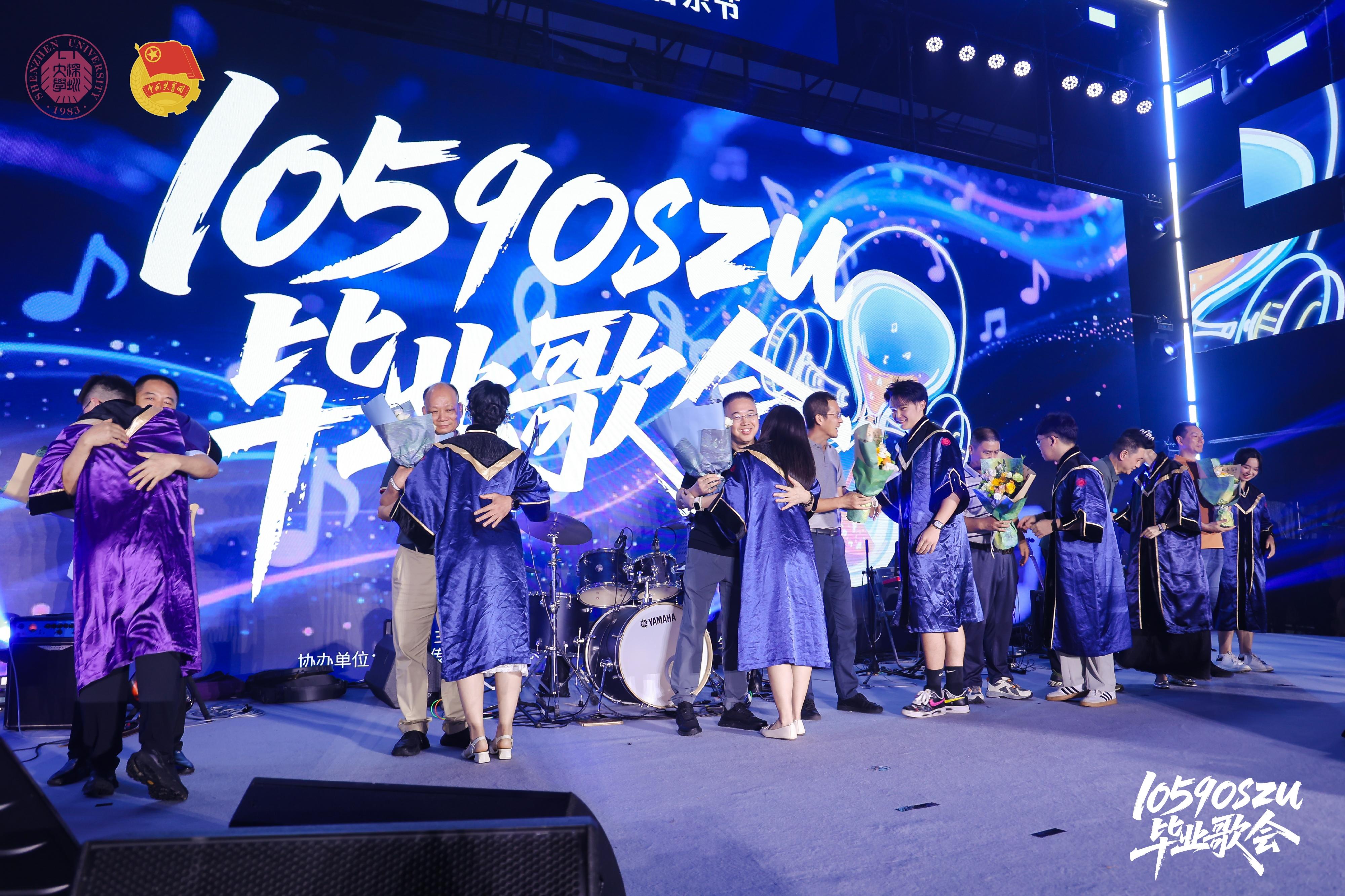 時值父親節,歌會特別設計了感恩父愛環節。《父親寫的散文詩》結束后,大屏幕上一位位畢業生述說父愛故事,一張張畢業生與父親的合影映入眼簾。8位畢業生代表手捧鮮花走向舞臺,將花束獻給父親,用真摯的擁抱訴說心中無盡的感恩與敬愛。“感謝四年前父母堅定地鼓勵我就讀深圳大學,這是我人生中最不后悔的決定之一!感謝學校和老師的培養和托舉,有幸山水一程,相遇無悔,征途萬里共赴!”經濟學院2021級經濟學卓越班的鄭楨棋激動地說。