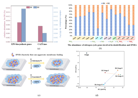 圖4(a)EPS生物合成基因和CAZYmes相關基因的豐度;(b)參與反硝化和DNRA的氮循環基因的百分比;(c)隨著C/N比的增加,甲酸鹽和乙酸鹽對可加重膜污染的DNRA細菌的變化;(d)細菌群落的PCA分析(D1:甲酸鹽進料;D2:乙酸鹽進料)。
